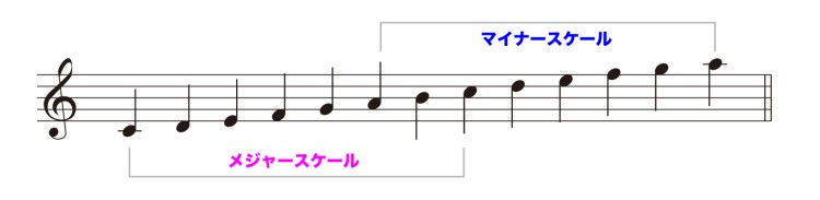 「ドレミファソラシド」は「メジャースケール」。その中のラから始めた音階「ラシドレミファソラ」が「マイナースケール」と呼ばれマイナーキーの基本的な音階となります。
