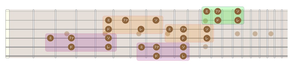 上の「指板図」は「ドレミファソ」という音の「ブロック」です。